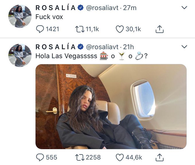 Mientras los premios de la 20ª edición de los Grammy Latino esperaban a que Rosalía pisara la alfombra roja, la artista se mostraba activa en las redes sociales. Después de subir una imagen en la que posaba vanidosamente en el jet privado con que se dirigía a la gala, Rosalía tuiteó ese ya sonado hit: «Fuck vox».