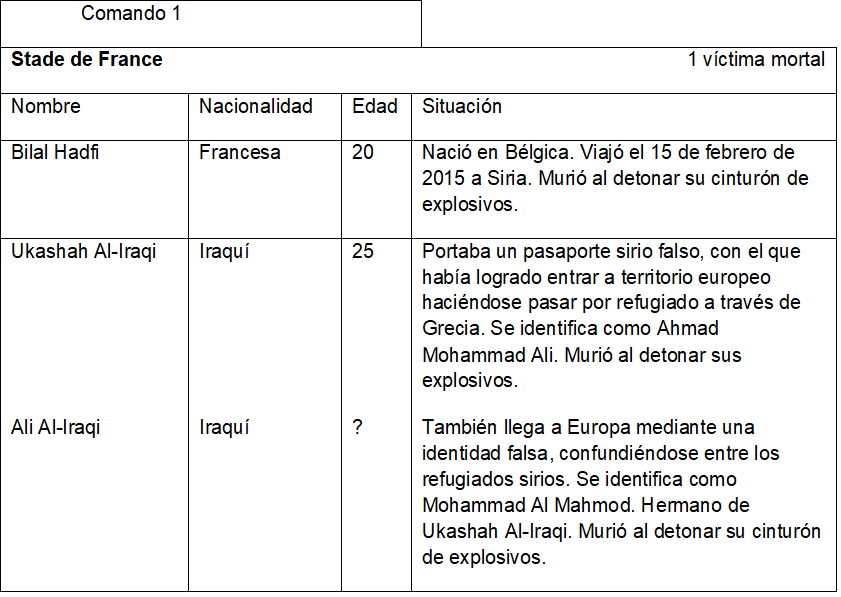 Una vez planificada la operación armada a partir de tres operaciones simultáneas en escenarios sensibles de la capital francesa, los combatientes se distribuyen en tres comandos distintos y se dirigen hacia los correspondientes objetivos (Seelow, et al., 2015). A fin de sintetizar cada una de las operaciones llevadas a cabo la noche de los ataques, los siguientes cuadros recogen el escenario y las víctimas causadas, así como los nombres, la nacionalidad, la edad y la situación de cada uno de los atacantes en función del comando del que tomaron parte[5].